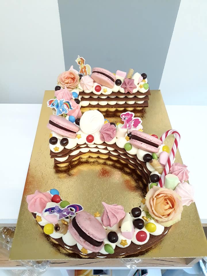Slovo/broj torta ukrašena cvijećem, voćem, čokoladicama, macaronsima